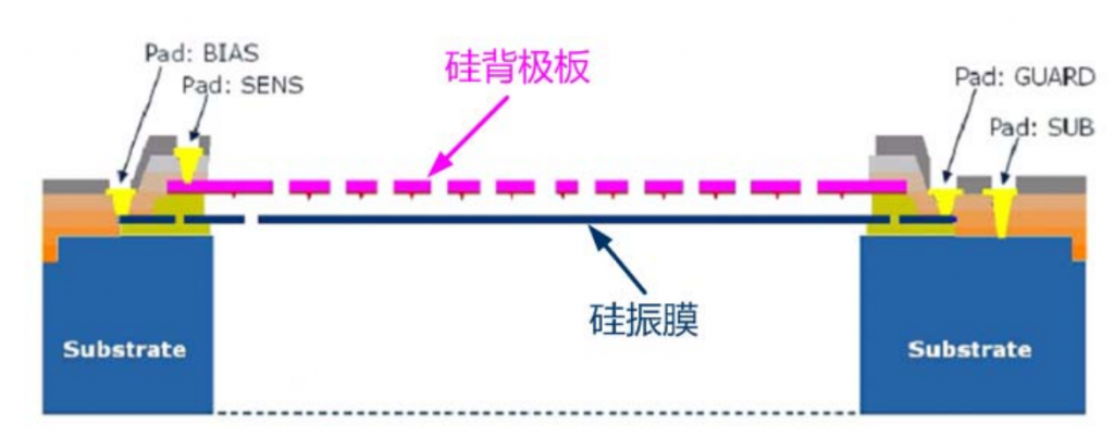 MEMS聲壓傳感器實際上是一個由硅振膜和硅背極板組成的微型電容器,硅振膜能感測聲壓的變化,將聲壓轉化為電容變化。